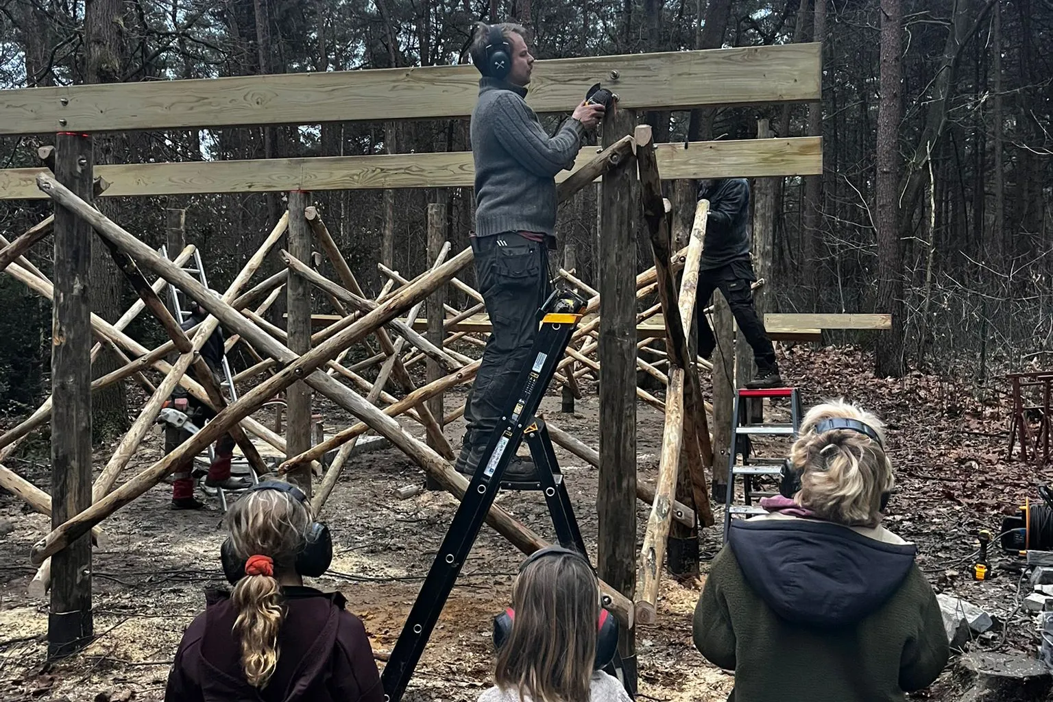 Na de fundering kwamen er steunpalen, en die werden stevig in de grond verankerd. Dan volgden de onderste draagbalken, waardoor het plateau vorm kreeg. Onze nieuwe boomhut gaat heel stevig staan – net als zijn broertjes.